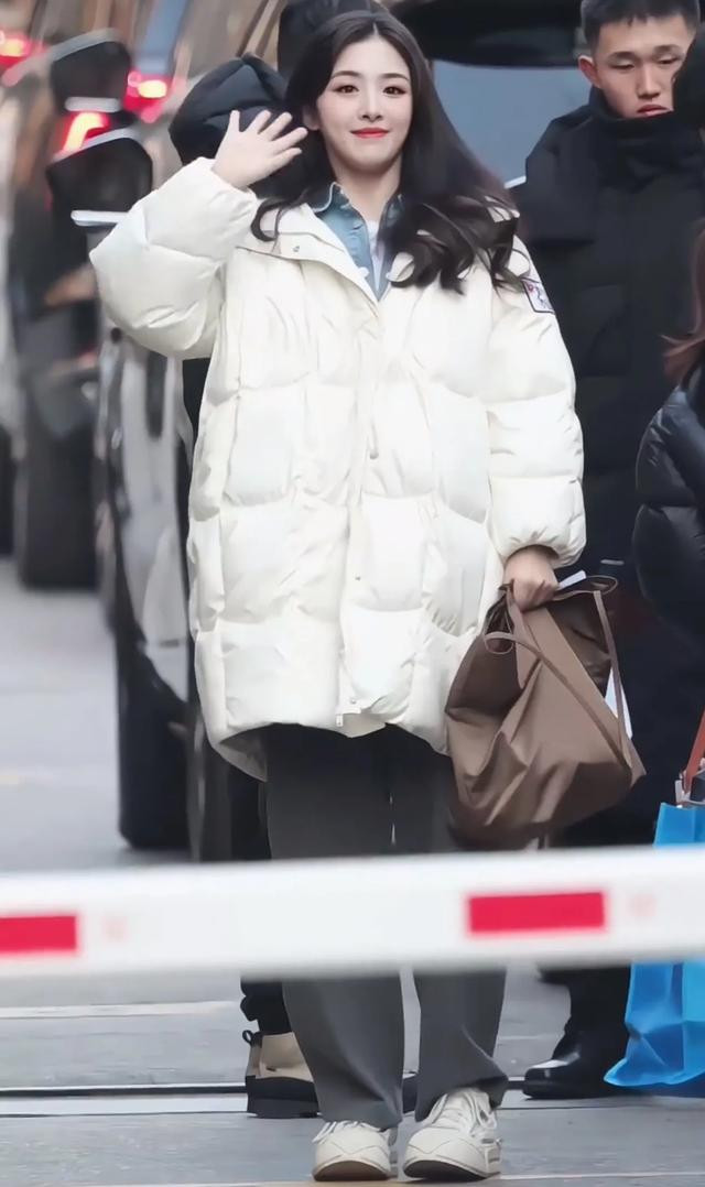 不同于常见的羽绒服搭配高跟鞋或半身裙的“正式感”,张含韵选择了更为休闲舒适的搭配方式——灰色直筒裤与白色厚底鞋。